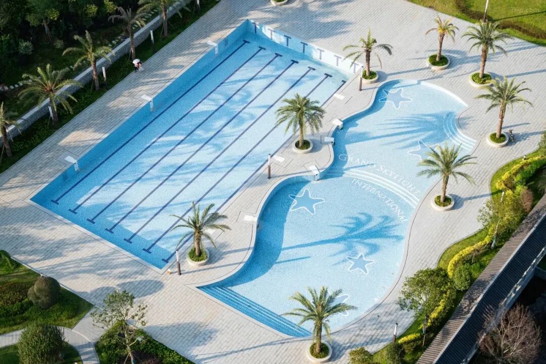 泳池采用“半标竞赛级泳道 + 亲子戏水区”设计,蓝白马赛克铺就高级简约质感,灵动海星图案点缀戏水区,棕榈树影与澄澈水面相映成趣,自然融入“园中筑殿”的东方造境。